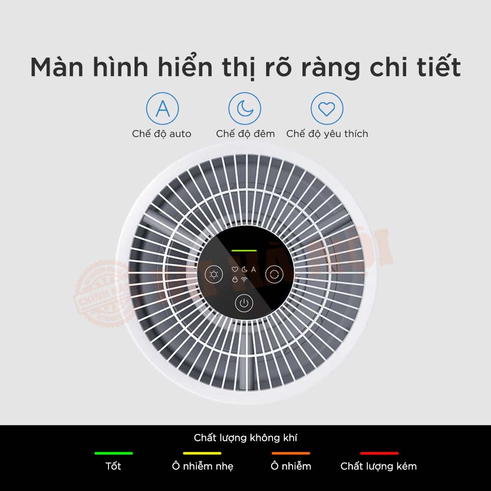 Mặt trên của máy là màn hình LED hiển thị chất lượng không khí, hệ thống cảm ứng để thay đổi chế độ sử dụng. Bạn chỉ cần chạm vào màn hình để điều chỉnh chế độ sử dụng (Im lặng/Tự động/Sức khỏe) để không khí trong lành hơn.Dữ liệu chất lượng không khí trong nhà trực quan từ đèn LED báo 4 màu: Cam, đỏ, xanh lá, vàng
