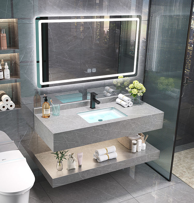 BÀN ĐÁ ĐÔI NHÂN TẠO CHỐNG XƯỚC NHẬP KHẨU NT45 - Chất liệu đá nhân tạo ghi xám chống xước nhập khẩu cao cấp, 2 tầng, kết hợp chậu sứ âm, vòi nóng lạnh và gương led cảm ứng. Kiểu dáng sang trọng, hiện đại, phù hợp với mọi kiến trúc và không gian nhà tắm.