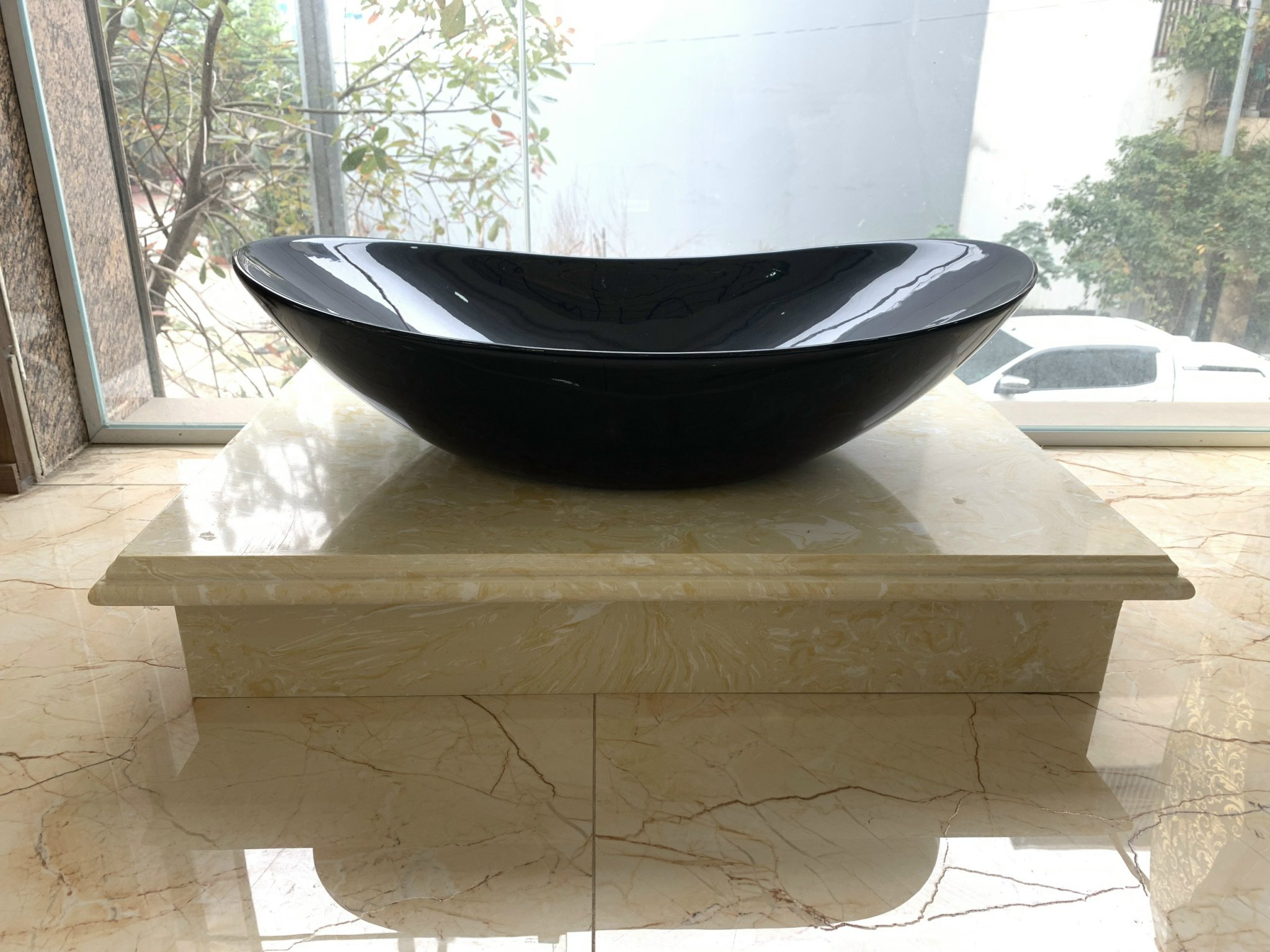 2. Chậu nổi bàn đá - bàn đá nhân tạo, chậu sứ thuyền sơn đen