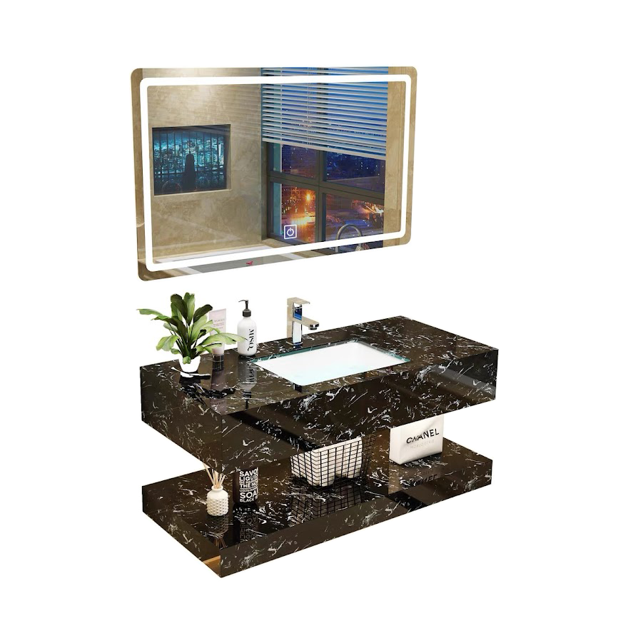 2. Bàn đá đôi nhân tạo kết hợp chậu sư âm - chất liệu sứ nung tráng men nano tuyết, bàn đá nhân tạo đen vân mây