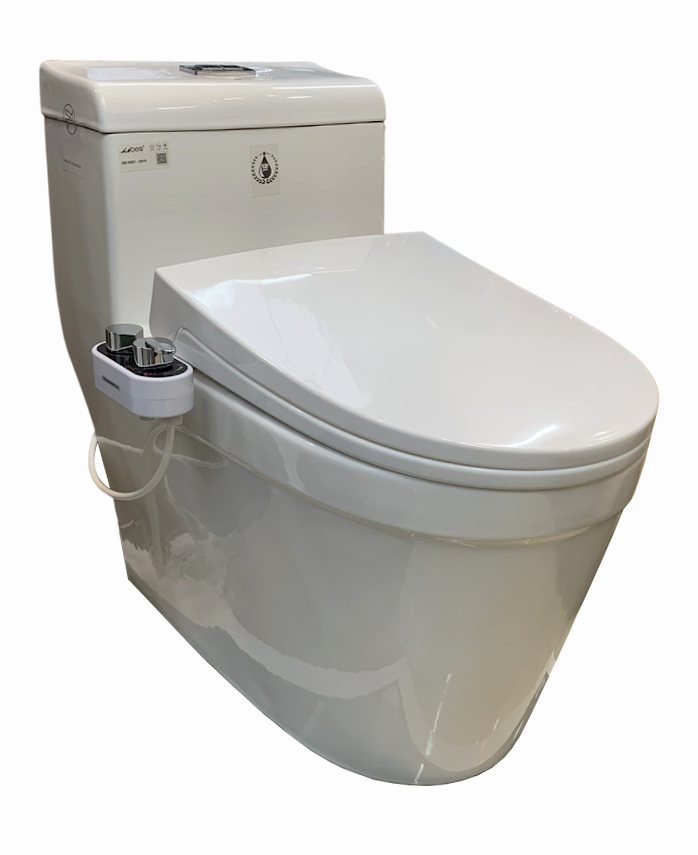 1. Bồn cầu liền khối trắng có xịt rửa thông minh - chất liệu sứ nung tráng men nano tuyết.
