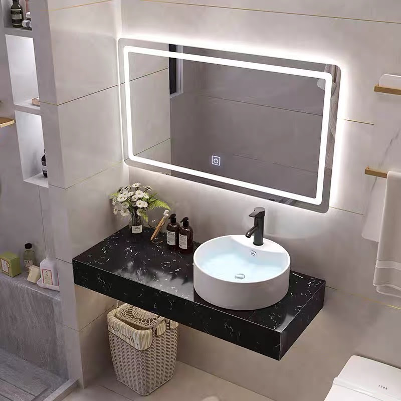 2. Bàn đá 1 tầng đen vân mây kết hợp chậu nổi - bàn đá nhân tạo, chậu sứ nổi nung tráng men nano tuyết