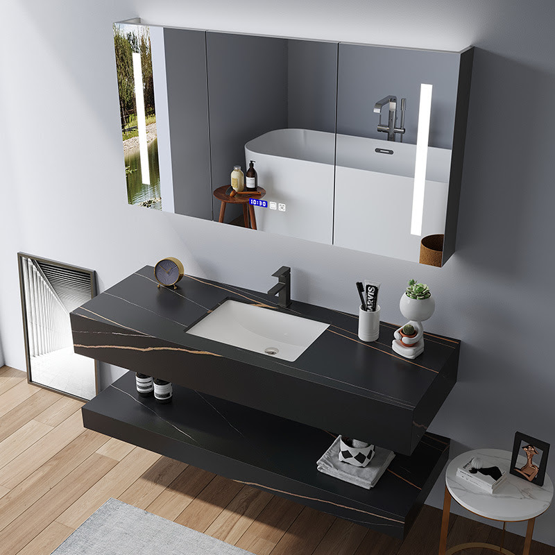 BÀN ĐÁ ĐÔI NHÂN TẠO CHỐNG XƯỚC NHẬP KHẨU NT56 - Chất liệu đá nhân tạo đen chống xước cao cấp, 2 tầng, kết hợp chậu sứ âm, vòi nóng lạnh và tủ gương led cảm ứng. Kiểu dáng sang trọng, hiện đại, phù hợp với mọi kiến trúc và không gian nhà tắm.