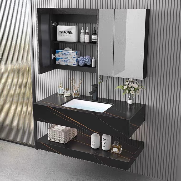 BÀN ĐÁ ĐÔI NHÂN TẠO CHỐNG XƯỚC NHẬP KHẨU BDNK.213 - Chất liệu đá nhân tạo đen chống xước cao cấp, 2 tầng, kết hợp chậu sứ âm, vòi nóng lạnh và tủ gương led cảm ứng. Kiểu dáng sang trọng, hiện đại, phù hợp với mọi kiến trúc và không gian nhà tắm.