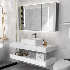 BÀN ĐÁ ĐÔI NHÂN TẠO CHỐNG XƯỚC NHẬP KHẨU NT06 - Chất liệu đá nhân tạo trắng chống xước nhập khẩu cao cấp, 2 tầng, kết hợp chậu sứ nổi, vòi nóng lạnh và gương led cảm ứng. Kiểu dáng sang trọng, hiện đại, phù hợp với mọi kiến trúc và không gian nhà tắm.