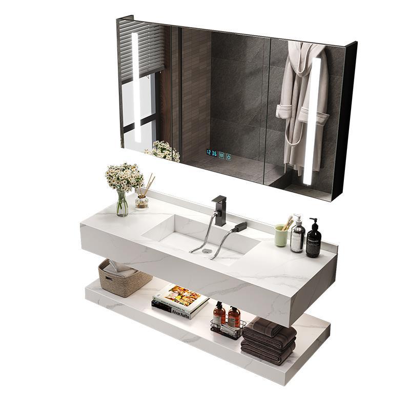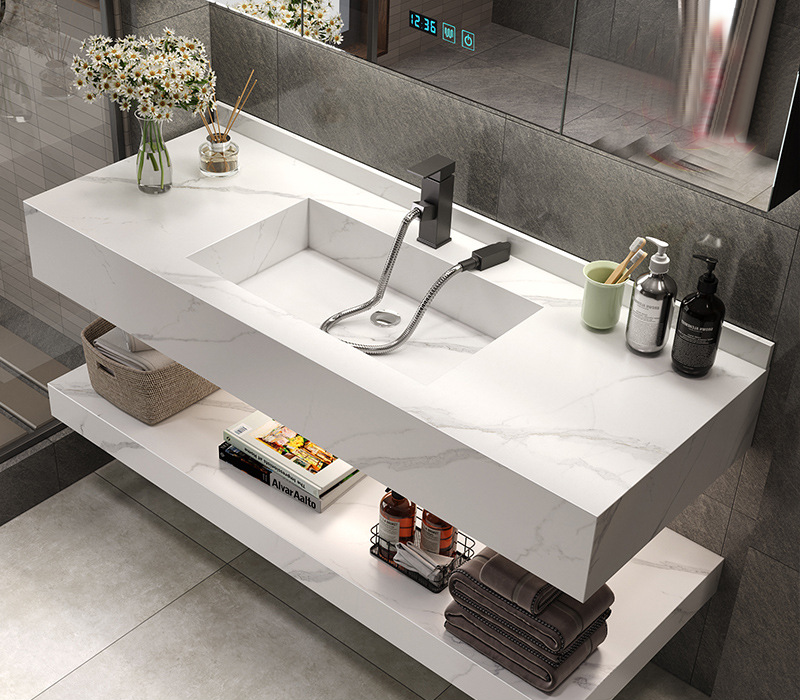 Bàn đá nhân tạo liền khối chống xước nhập khẩu cao cấp, bao gồm tầng trên và tầng dưới, vòi lavabo nóng lạnh, tủ gương led cao cấp chất liệu nhựa chịu nước