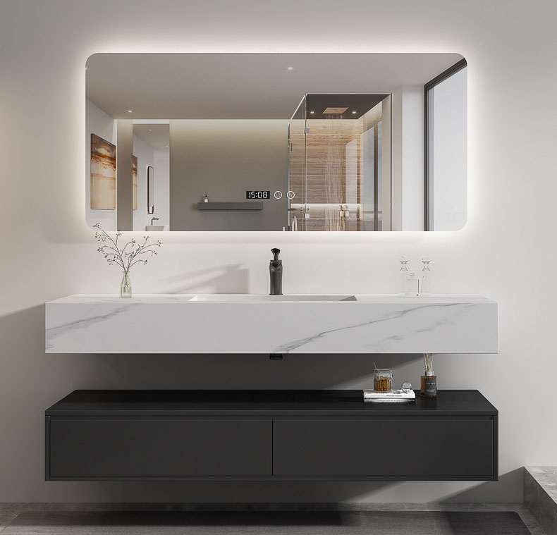 BÀN ĐÁ ĐÔI NHÂN TẠO LIỀN KHỐI CHỐNG XƯỚC NHẬP KHẨU BDNK.218 - Chất liệu đá nhân tạo trắng chống xước liền khối cao cấp, kết hợp tủ dưới, vòi nóng lạnh và gương led cảm ứng. Kiểu dáng sang trọng, hiện đại, phù hợp với mọi kiến trúc và không gian nhà tắm.