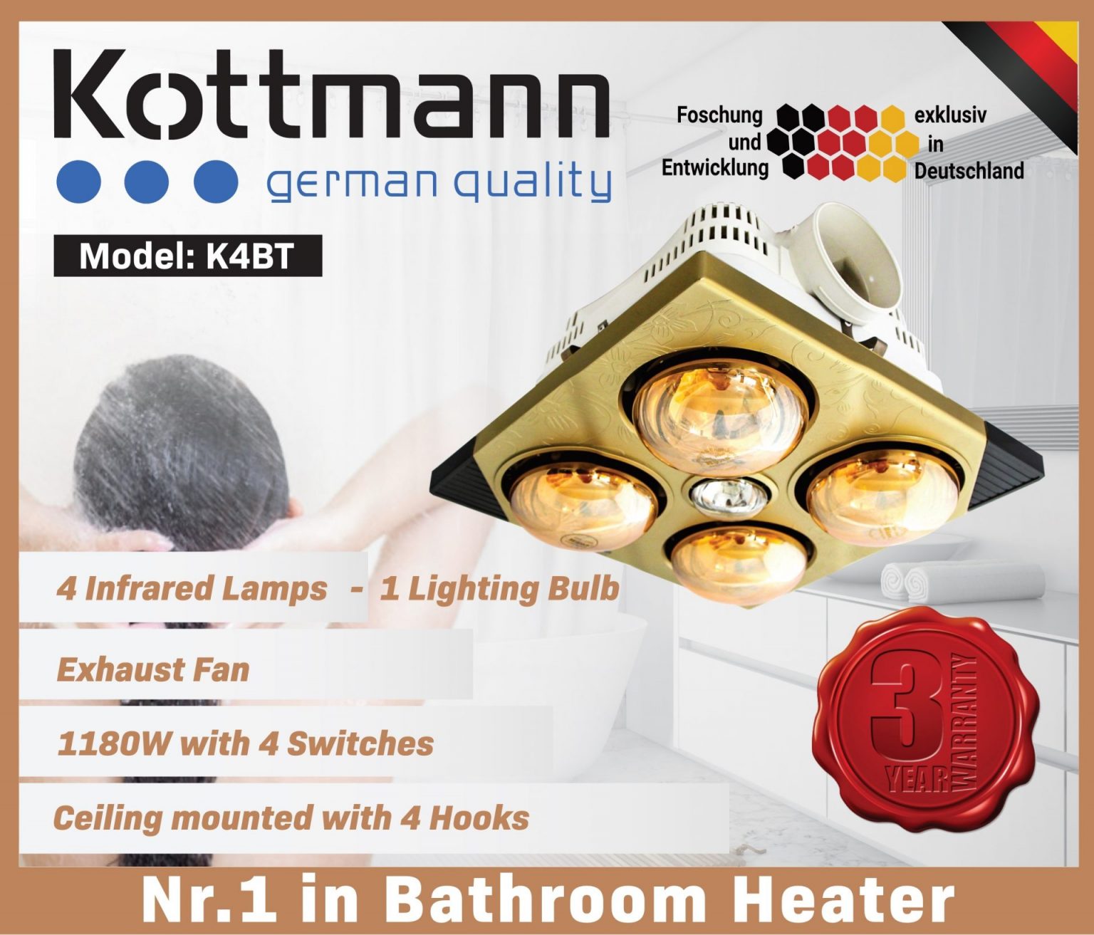 K4BT - Đèn sưởi nhà tắm Kottmann 4 bóng âm trần