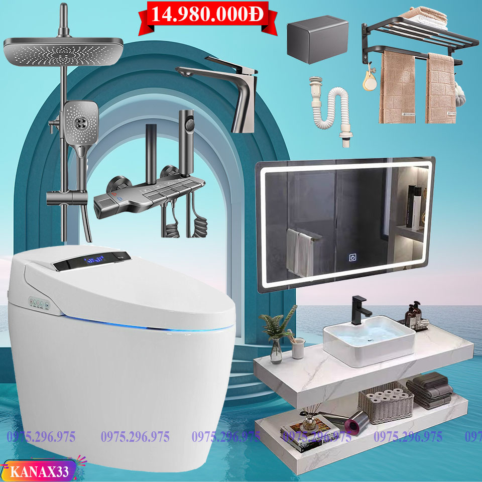 - KANAX33 - Combo trọn bộ bồn cầu thông minh, bàn đá 2 tầng chống xước, sen cây bàn phím ghi xám...