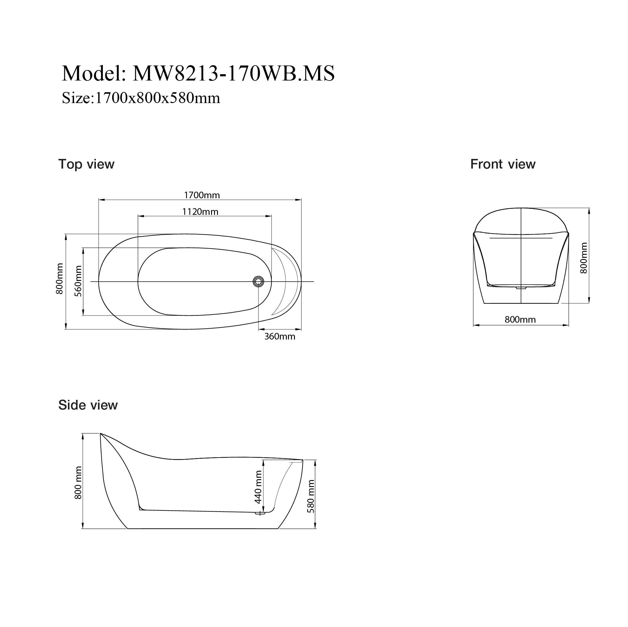 MW8213-170WB.MS - Bồn tắm massager cao cấp, chất liệu Acrylic. Kích thước: 1700 x 780 x 760(mm)