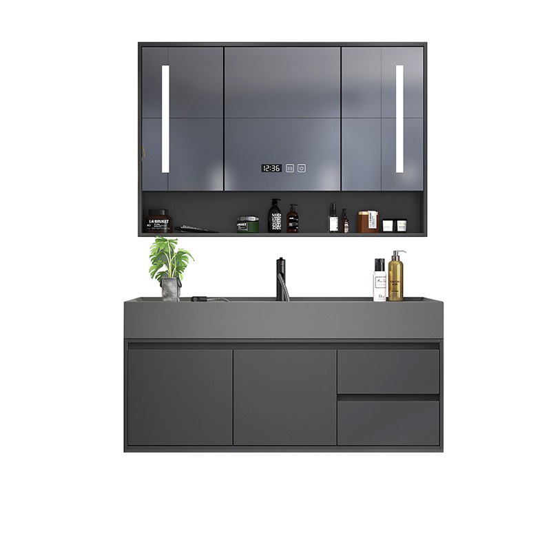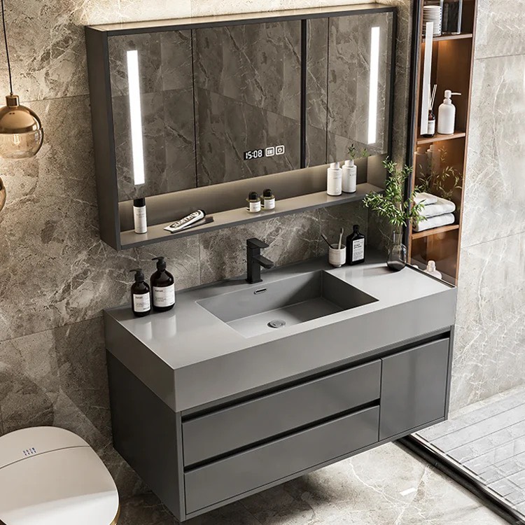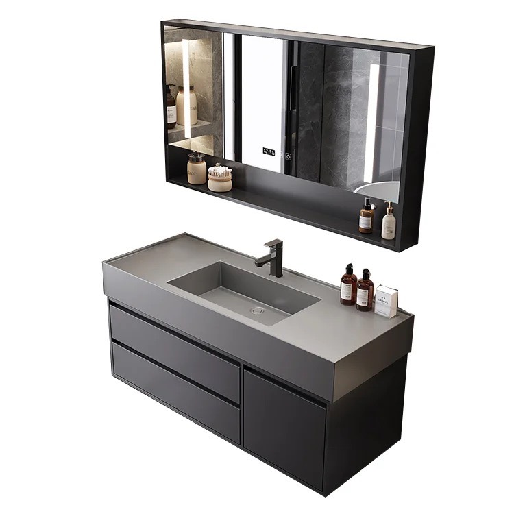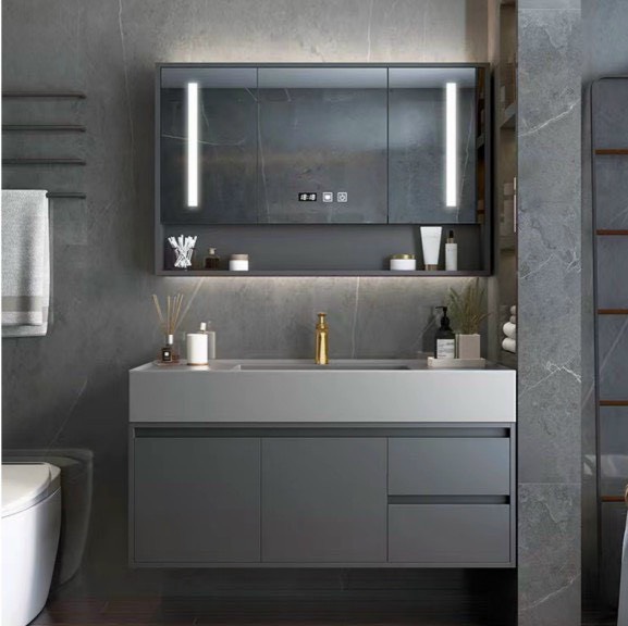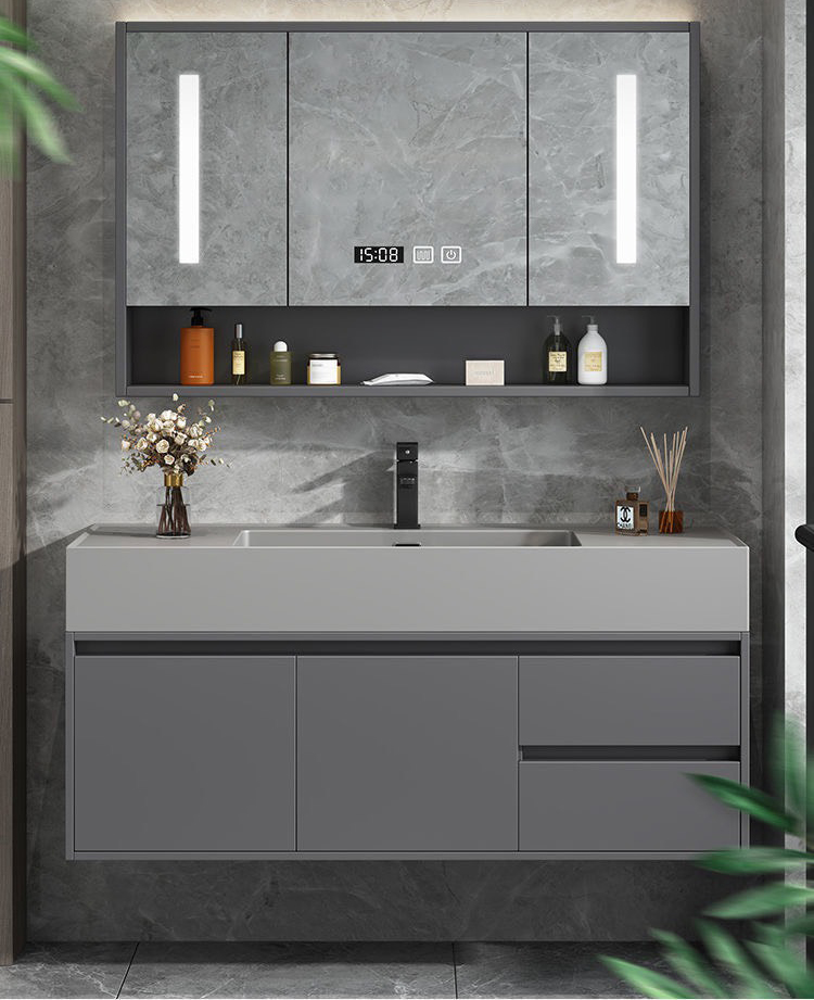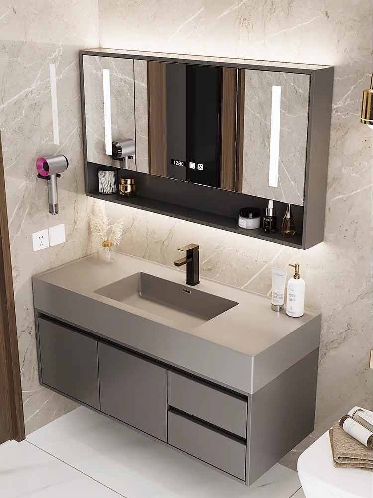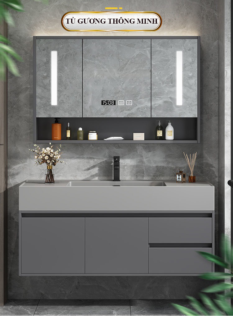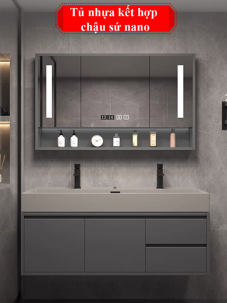 TC187 - Tủ chậu nhựa, tủ gương thông minh kết hợp chậu đá thạch anh nano liền khối
