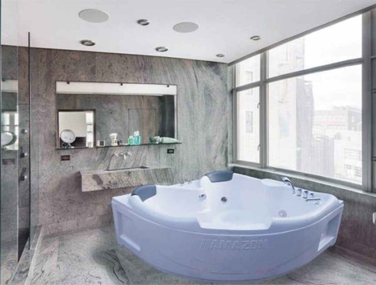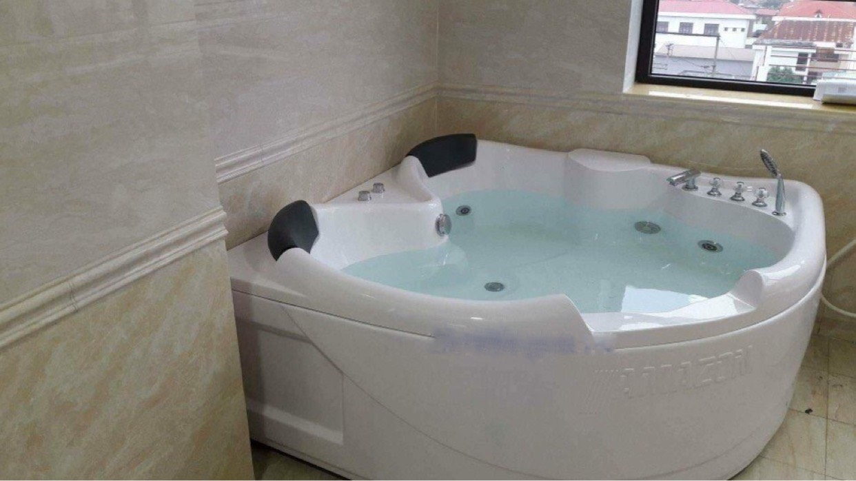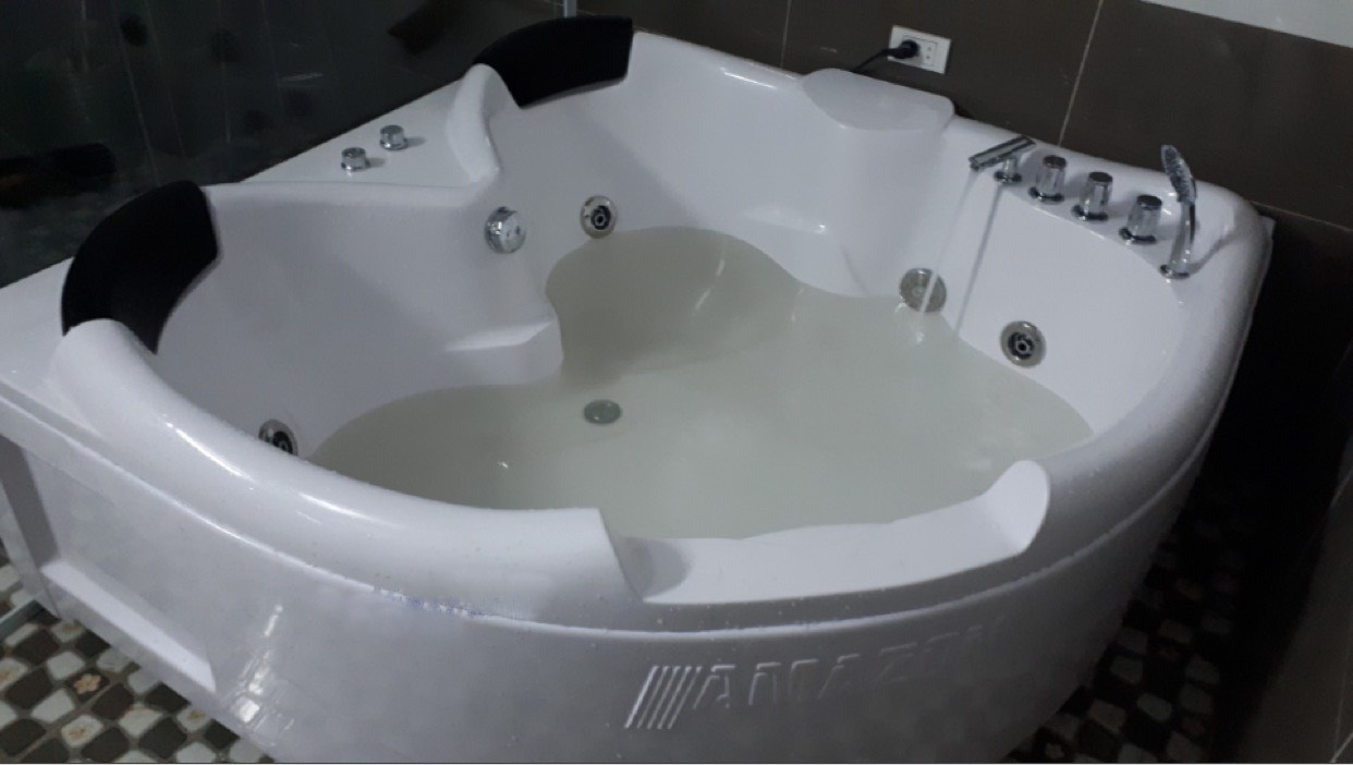 | Tính năng | Bồn tắm sục góc đôi, chân Inox, xifong đồng. |