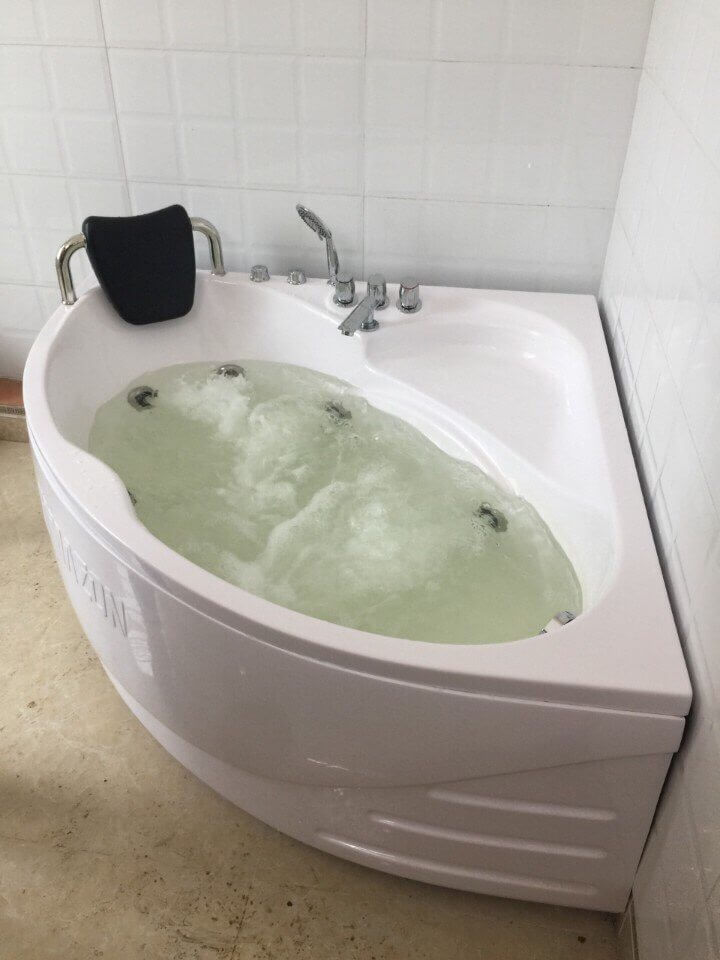 | Tính năng | Bồn tắm sục góc đơn, chân Inox, xifong đồng. |